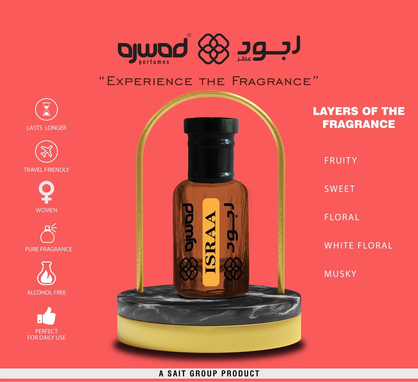 Experience Israa’s luxuriously fruity, sweet, and floral aroma and feel refreshed throughout the day. With notes of delicate white flower and musk, it’s the perfect scent for any woman. Plus, its alcohol free and travel friendly formula lasts even longer than most perfumes–take it with you and enjoy it daily!